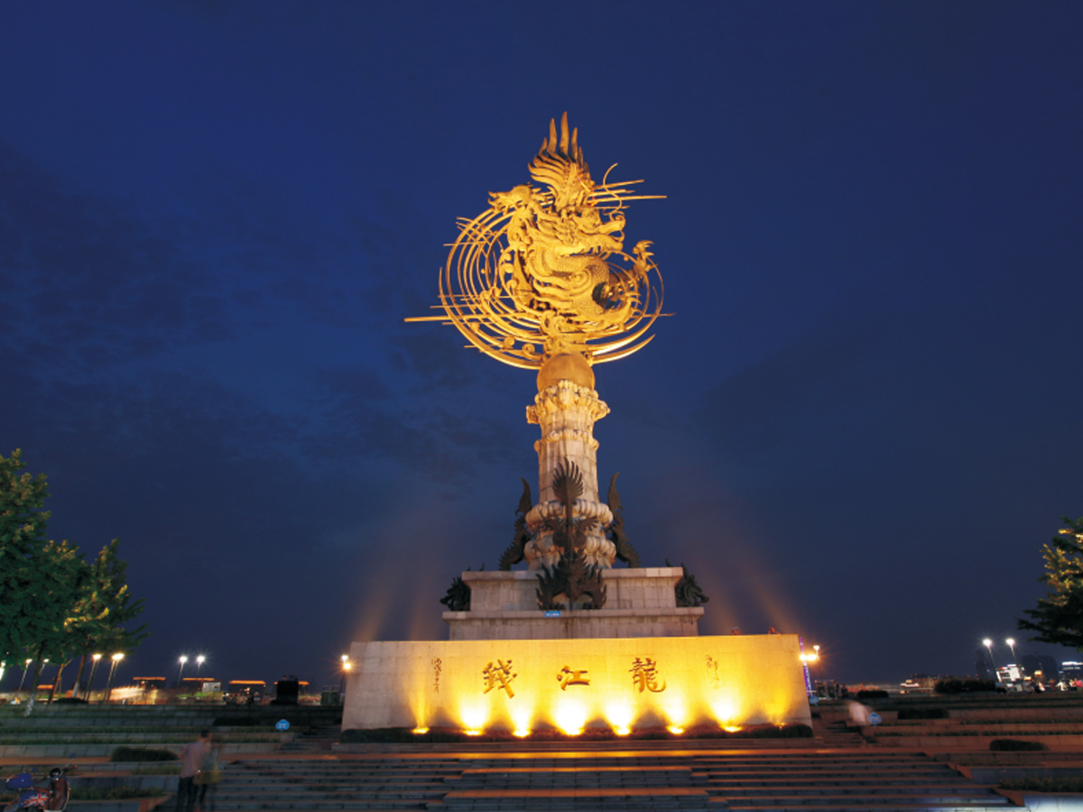 該雕塑位于浙江省杭州市錢塘江南岸濱江公園東側(cè)與西側(cè)錢王射潮遙相呼應(yīng)。高42米,由青銅鑄造和花崗巖雕刻而成,于2007年6月正式落成。仰視巨雕,可見(jiàn)花崗巖的底座上盤繞著四條龍,激情翻騰,陣陣?yán)嘶?;中部金球上盤旋著一條巨型前江壟,龍高27.1米,昂首東向大海,龍身蜿蜒騰躍,龍尾直插云天,氣勢(shì)逼人。